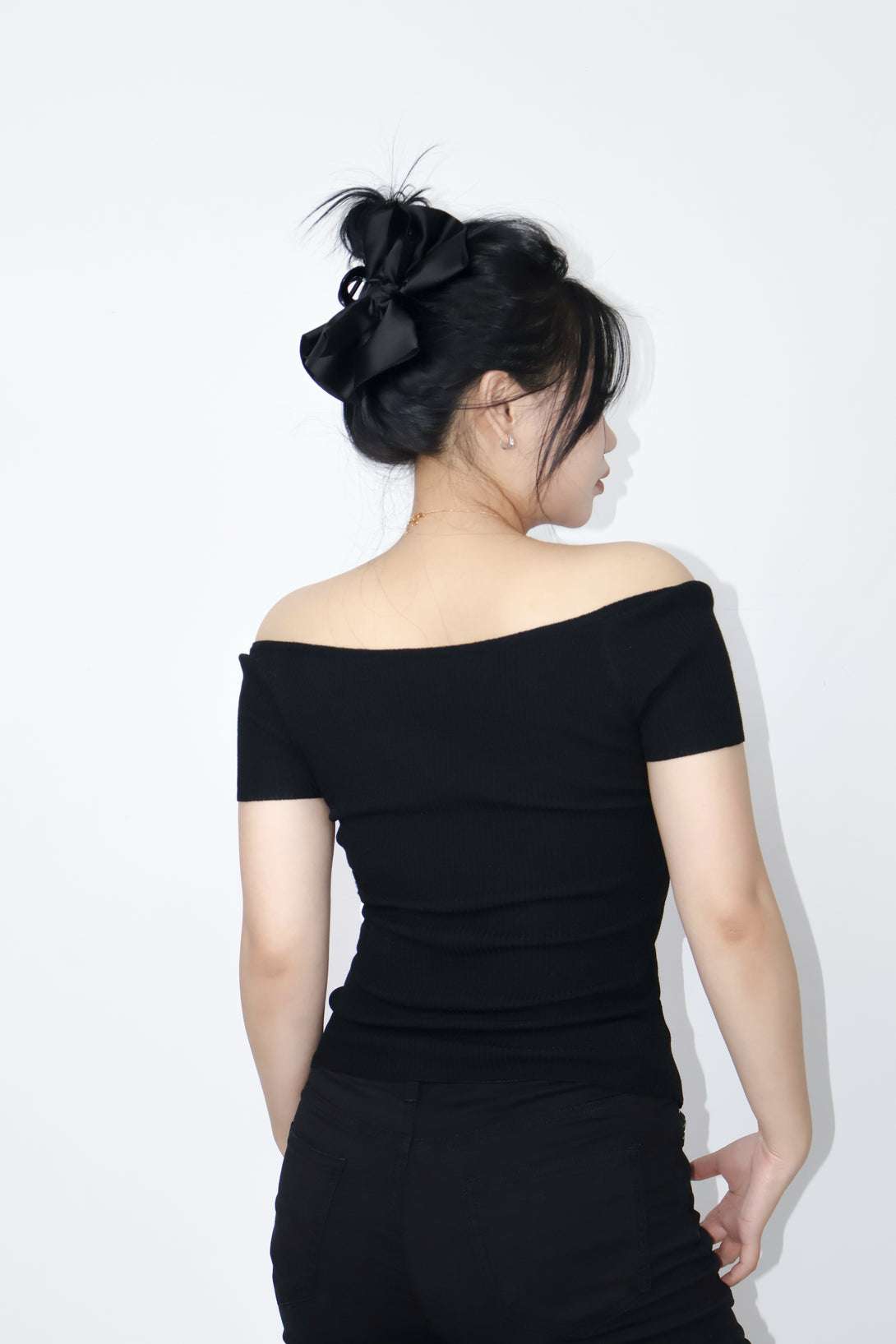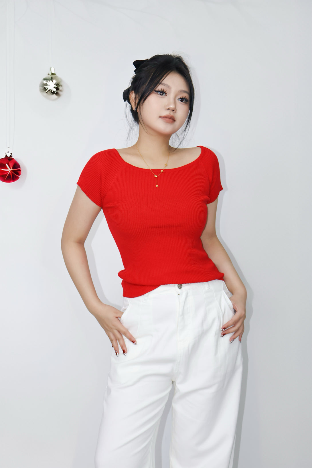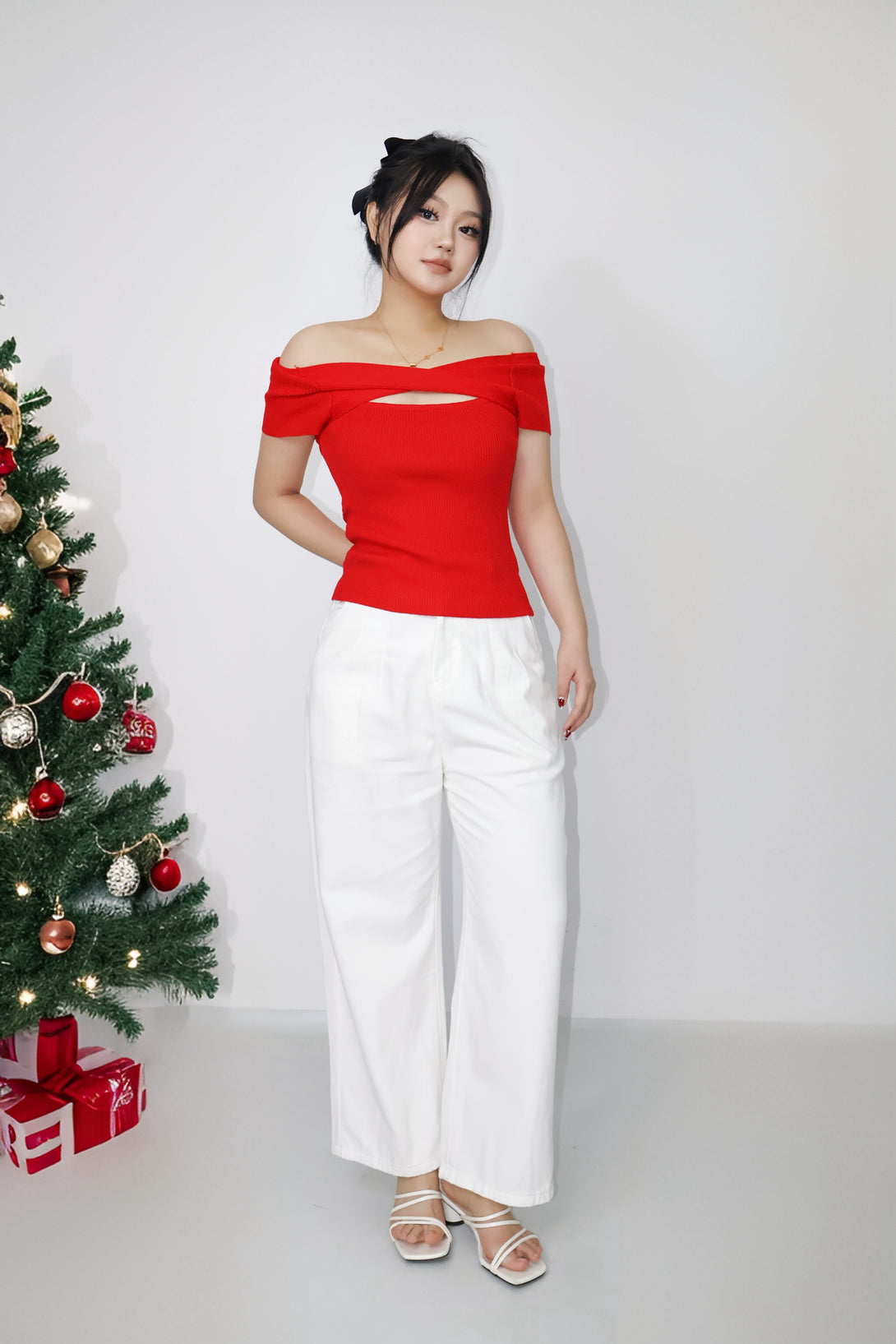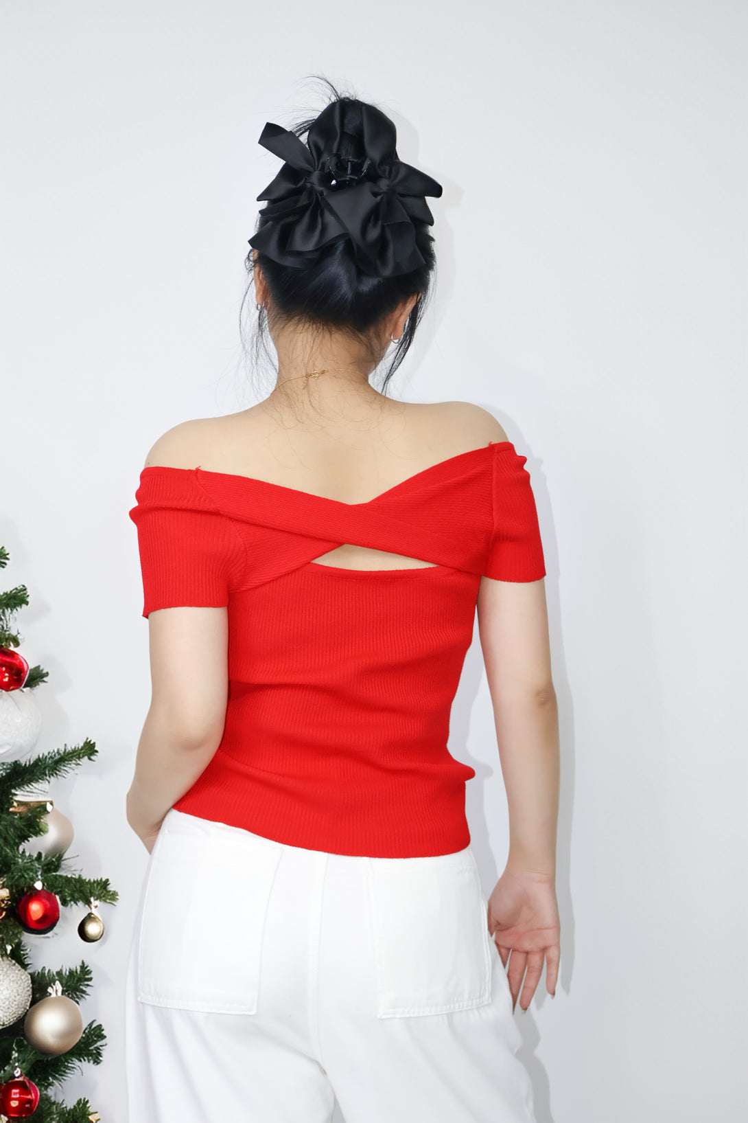 Turn up the charm with this off-shoulder ribbed knit top, designed to hug your curves and elevate any festive or everyday look. Featuring a soft stretch fit and a subtle cut-out detail, this reversible design lets you switch between a bold front or a sleek back—two looks in one versatile piece. Cozy, flirty, and effortlessly stylish.